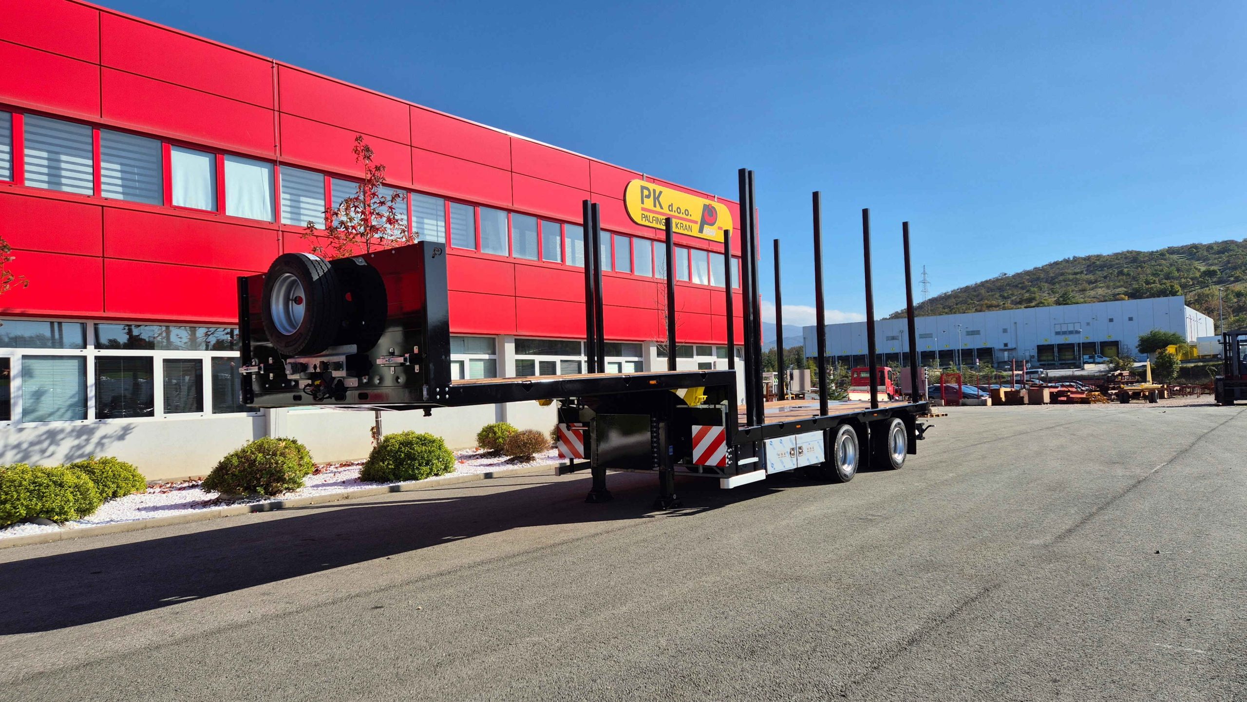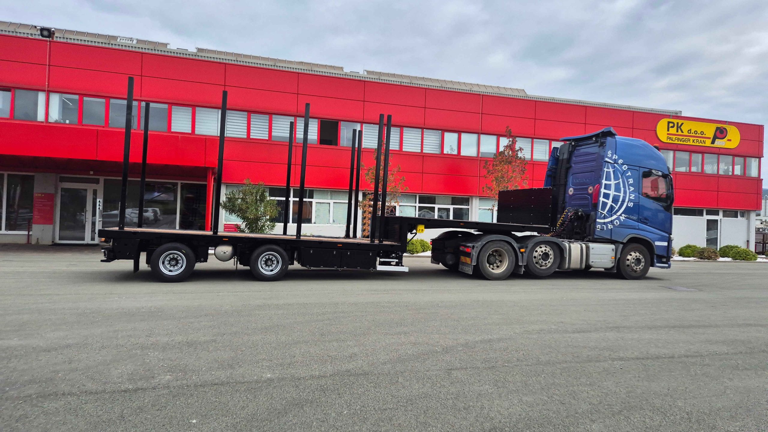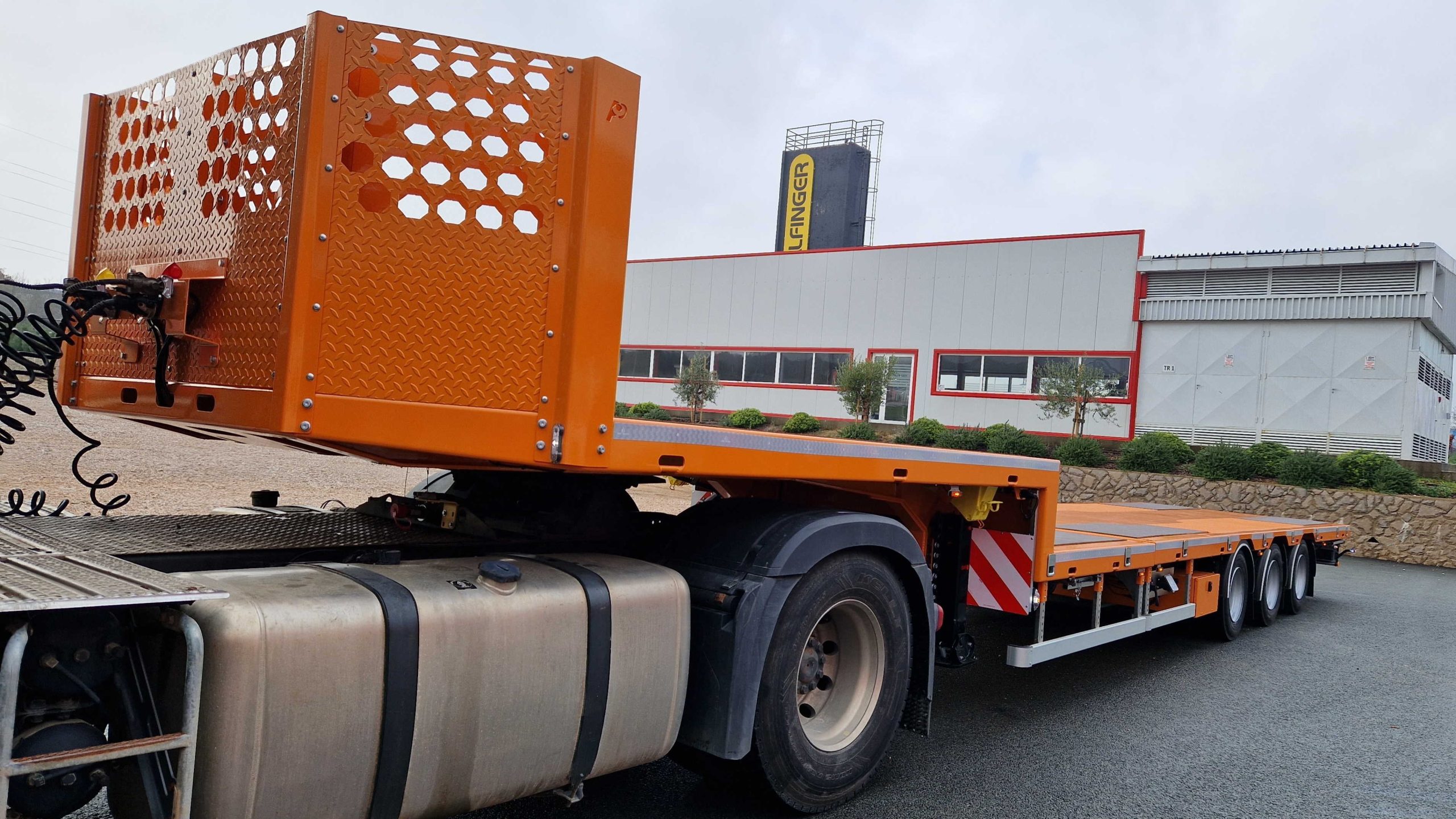 The semi-trailer is equipped with hydraulically steered axles, controlled via a remote, which significantly facilitates maneuvering and turning in tight spaces.
