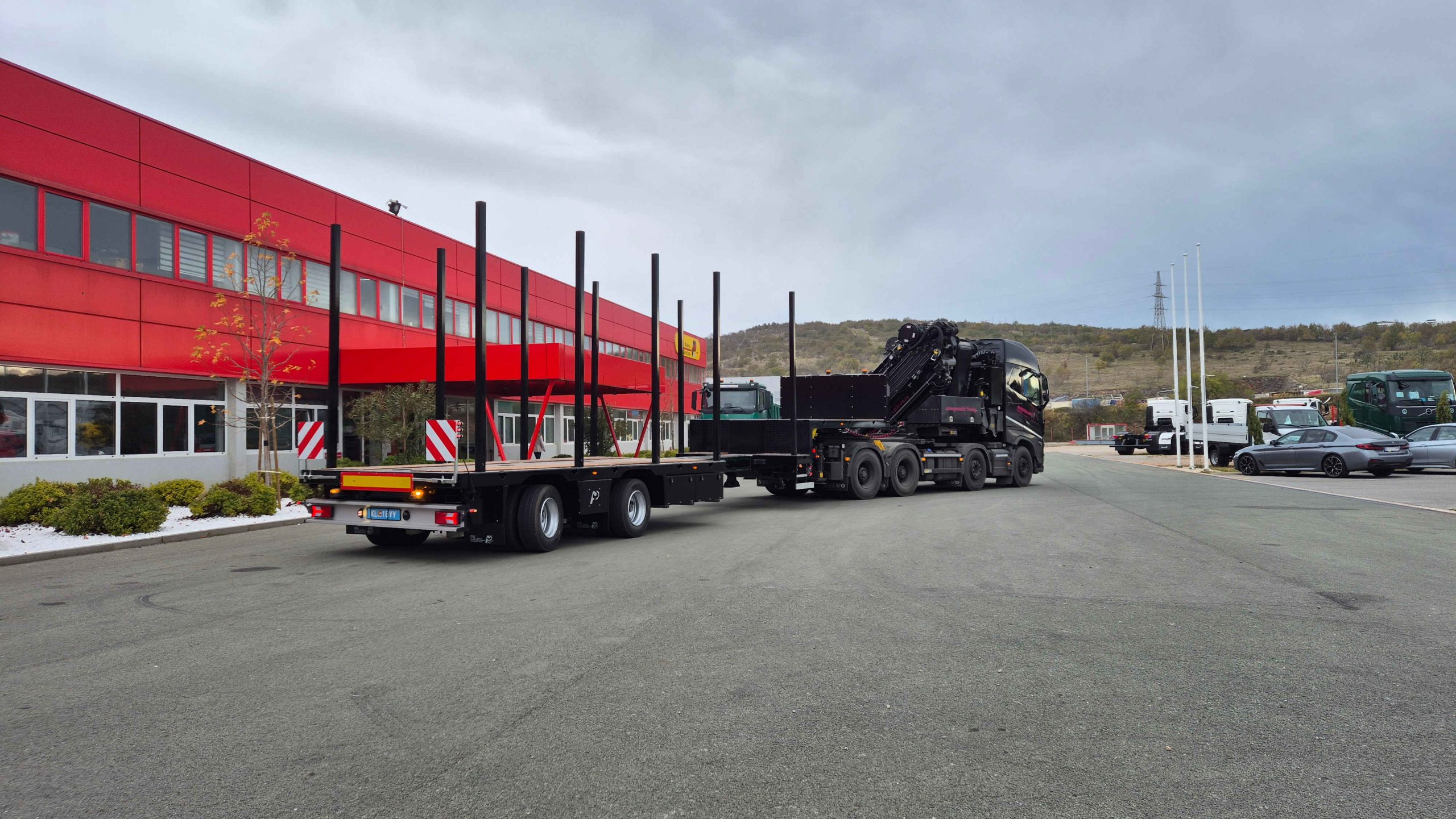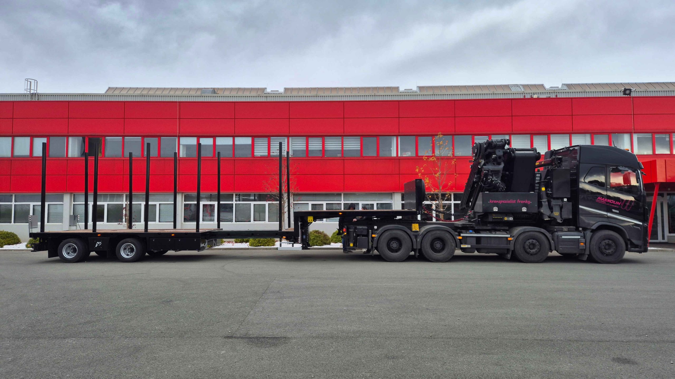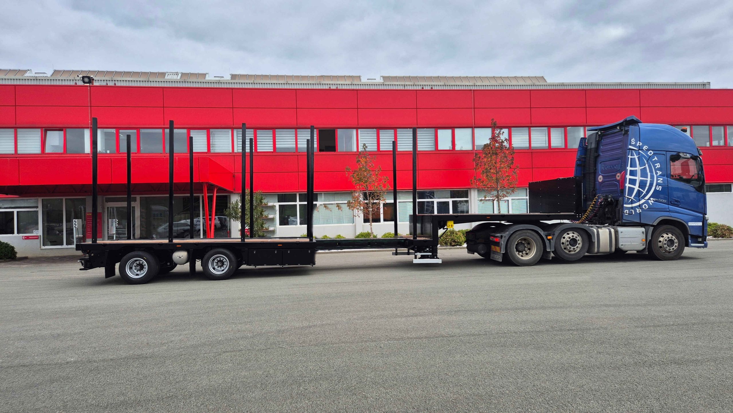 The semi-trailer is equipped with hydraulically steered axles, controlled via a remote, which significantly facilitates maneuvering and turning in tight spaces.