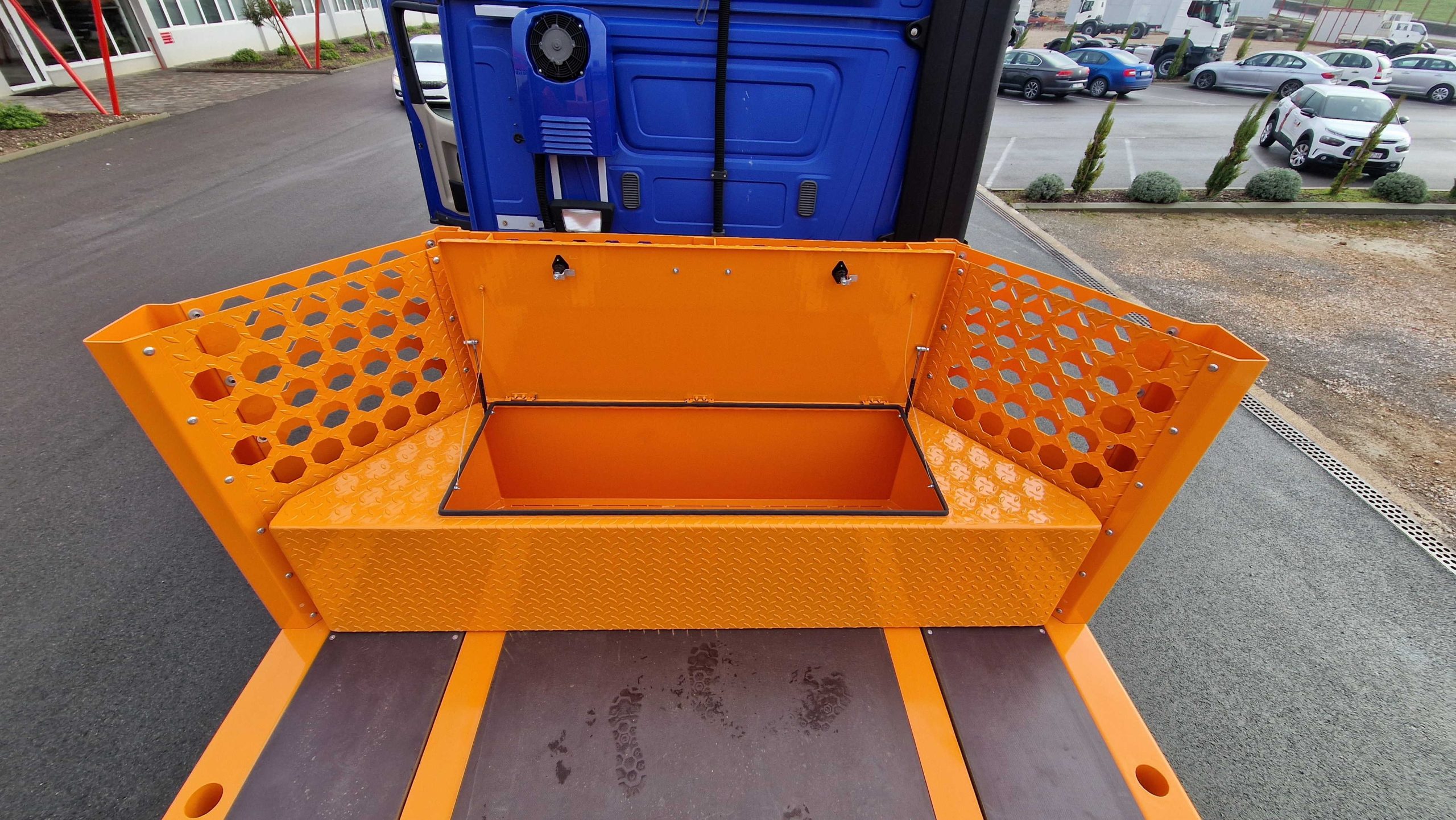 Pipes for securing cargo can be installed in the edge profiles, while additional equipment includes toolboxes, wedge holders, and cargo securing systems.